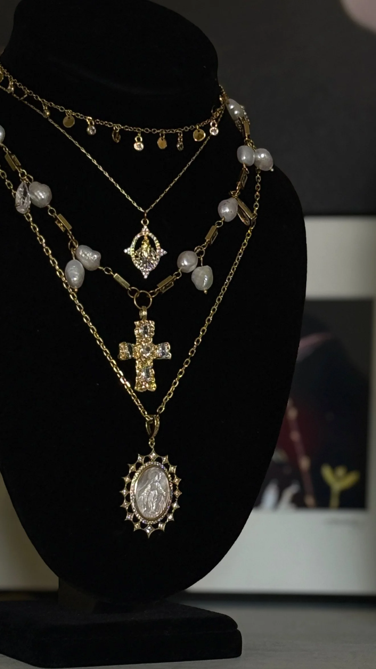 Intricate metal purse with intricate detailing, has one Pearl cross necklace, and one multi chain and charm necklace that can also be used as belt.